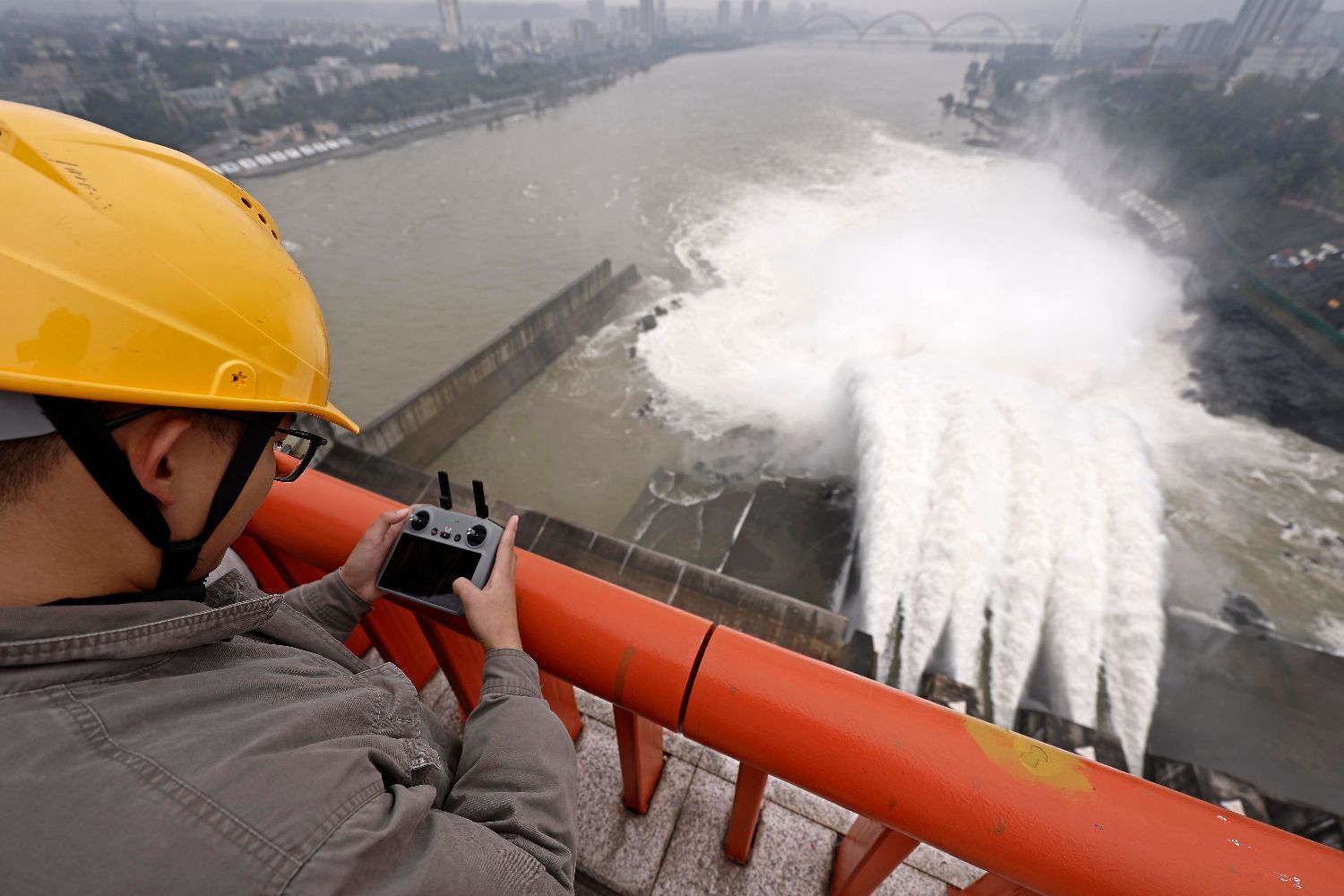 图为10月22日,工作人员用无人机监控丹江口大坝运行情况。