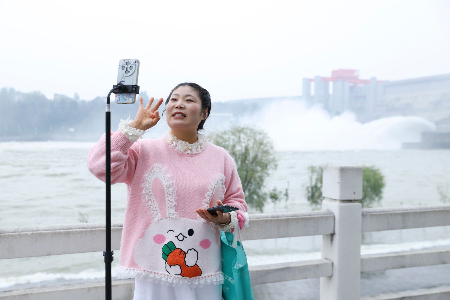 图为10月22日,在网络平台有1万多粉丝的市民石明梅在直播丹江口大坝泄洪情况。