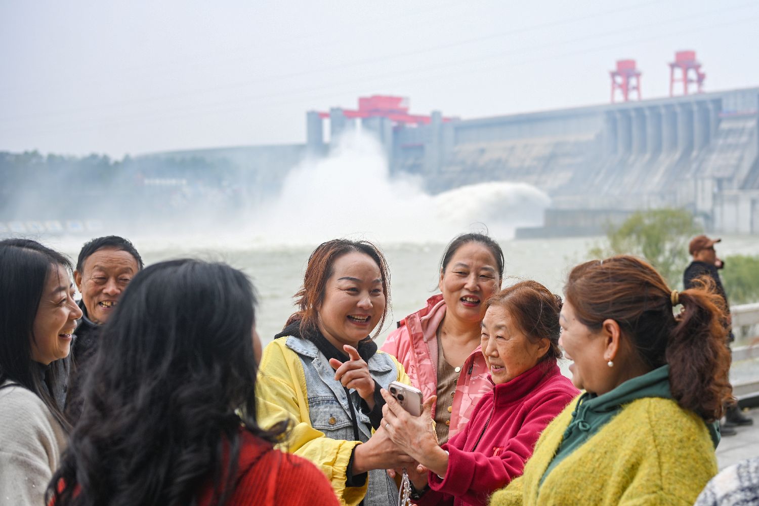 图为10月22日,湖北丹江口,女士们在欣赏拍摄的合影,远处的丹江口大坝正在泄洪。
