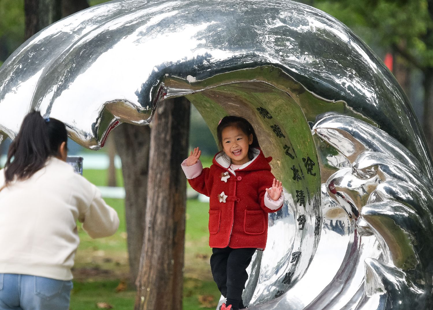 图为10月22日,小朋友在汉水文化公园打卡拍照。