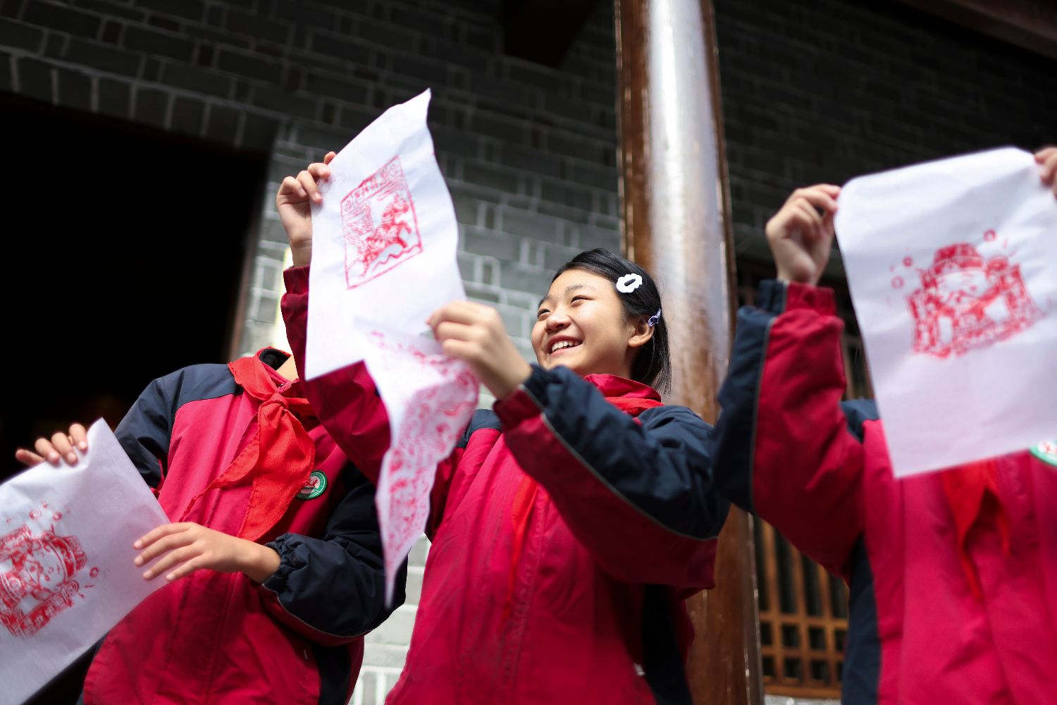 图为10月23日,在世美书院内,习家店镇小学五(5)班的学生王心悦(中)在欣赏自己的拓印作品。