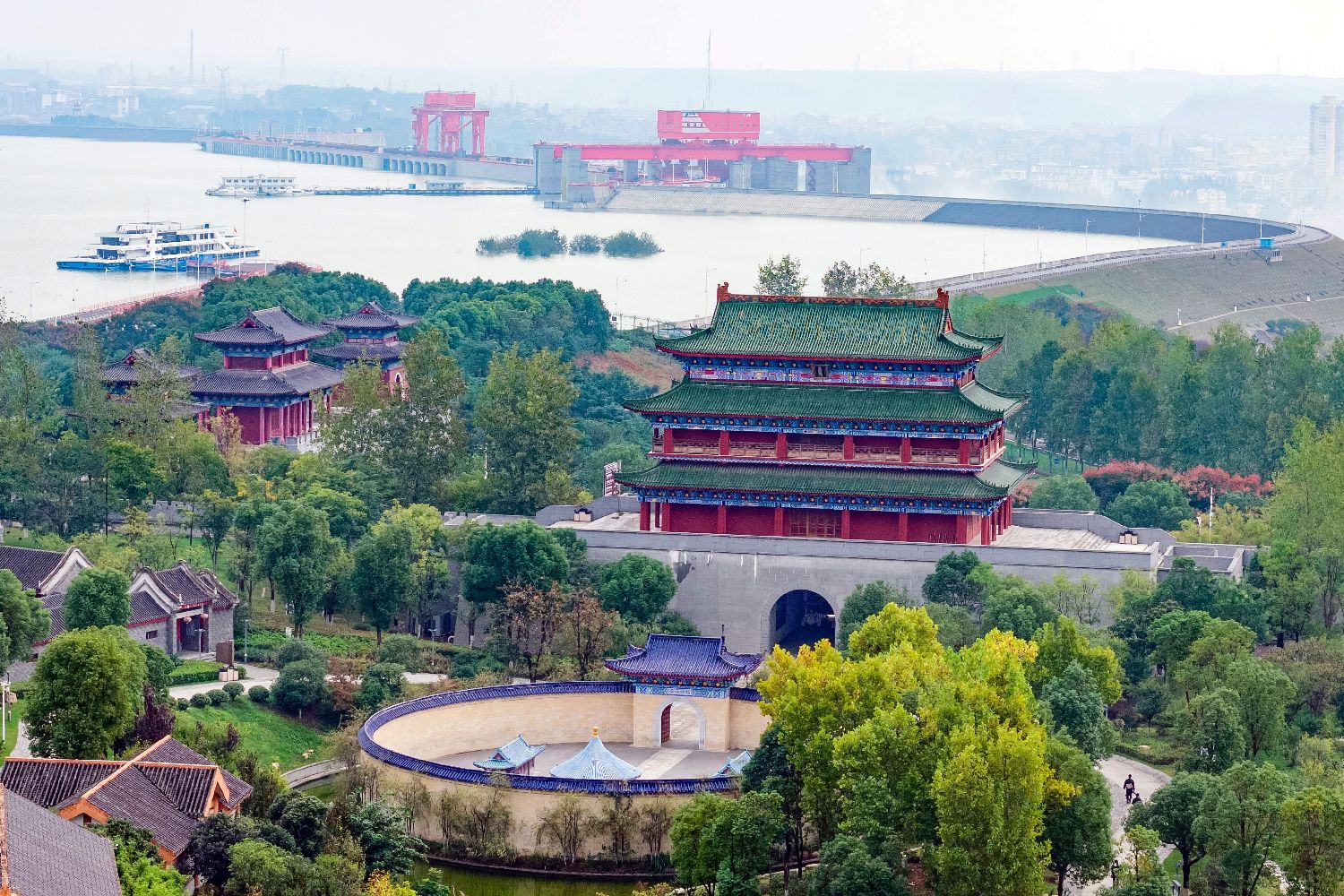 图为10月22日,湖北丹江口,南水调北中线工程纪念园内的“回音壁”等建筑,远处是丹江口水库和丹江口大坝。