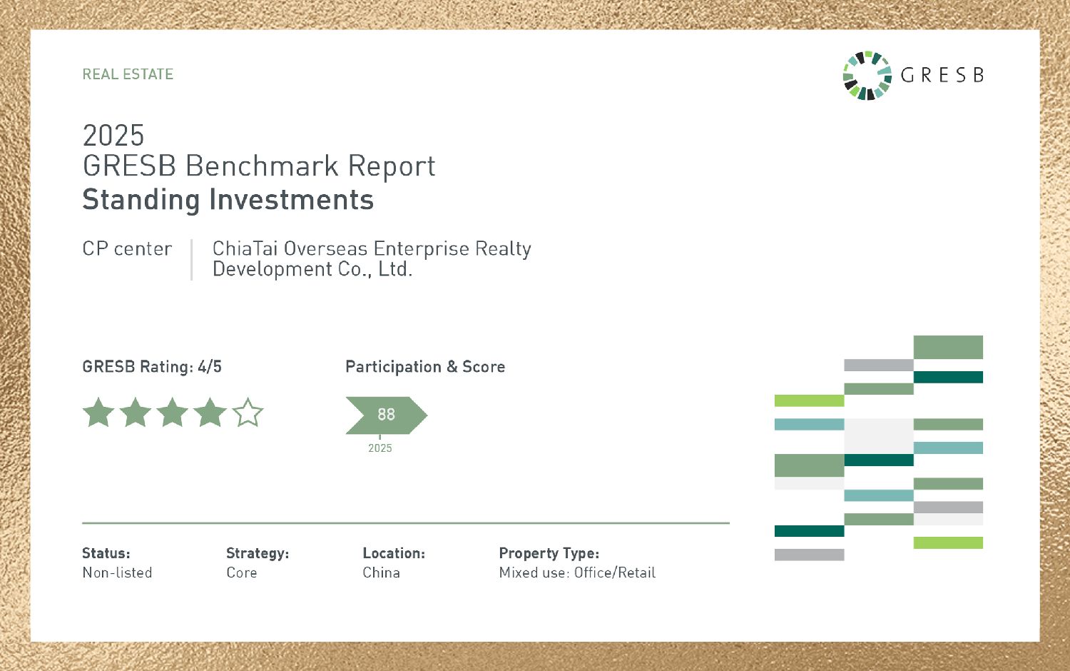 北京正大中心在2025年首次参与全球房地产可持续性评估(GRESB),获得四星评级。