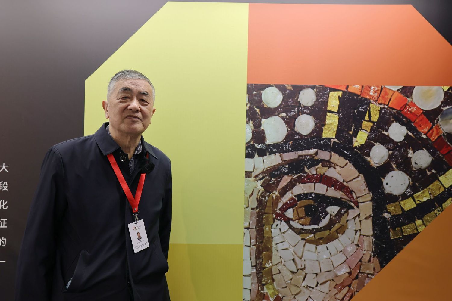 2月10日,朱宏在北京中华世纪坛与展览《马赛克|意大利永恒艺术的密码》海报合影。(图片来源:王木羊 摄)