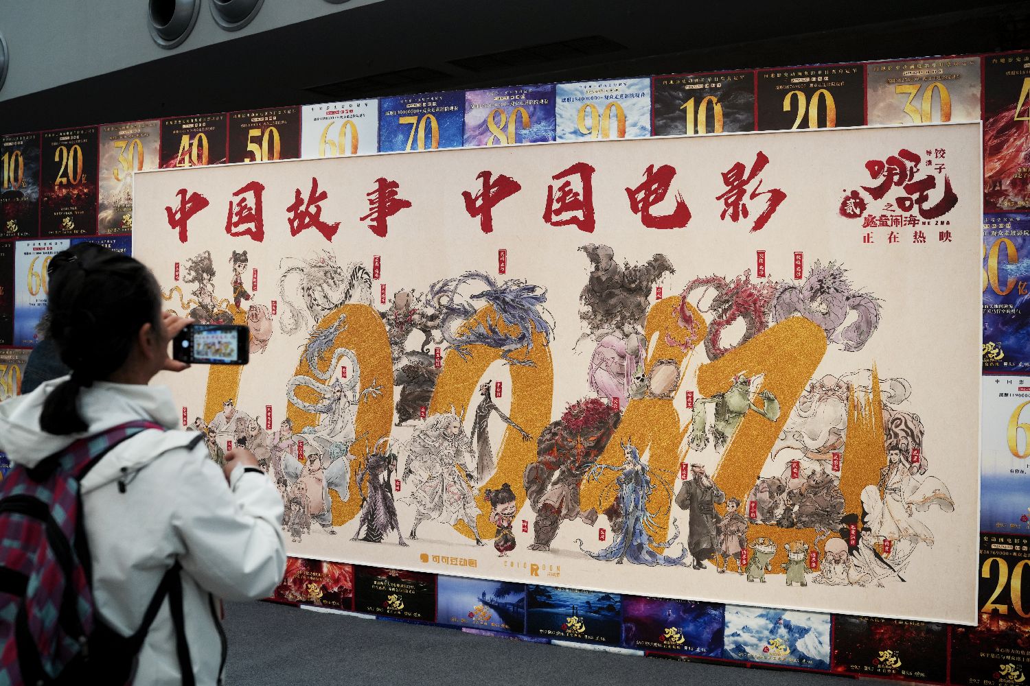 2025年4月18日,电影《哪吒之魔童闹海》破亿手绘海报展在第十五届北京国际电影节郎园Station分会场开展。(图片来源:中新社)