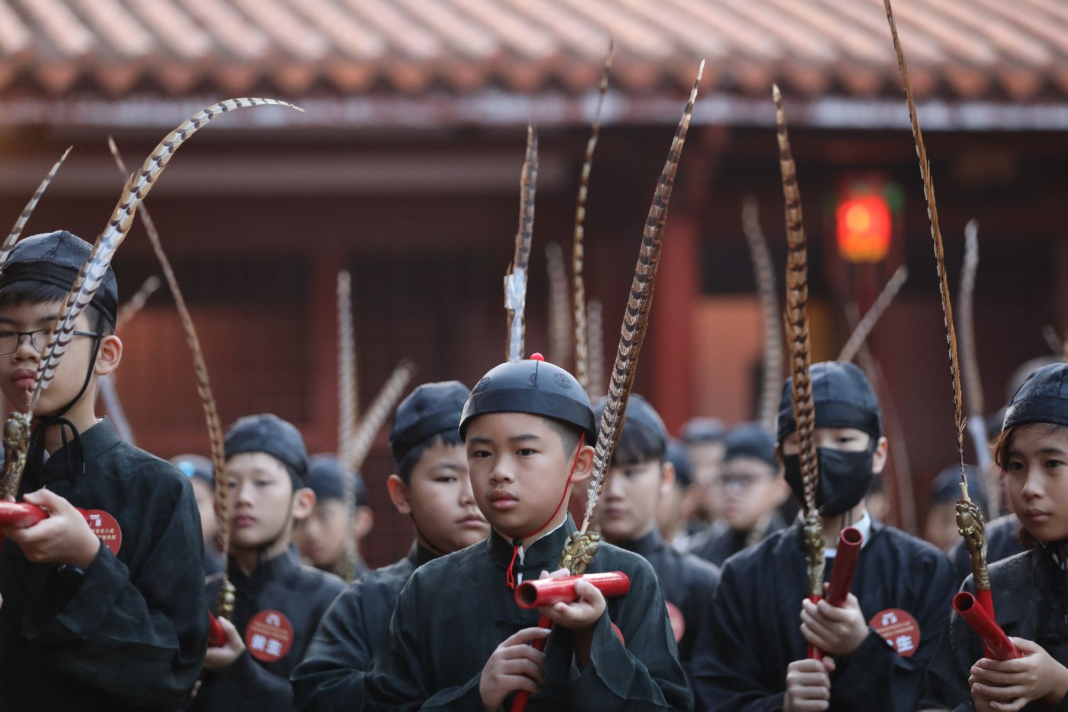 约7时,磬声清越,礼成退班,代表当日祭孔典礼结束。前来观礼的民众和佾生并未散去,反而争相进入大成殿,参加“拔智慧毛”活动。