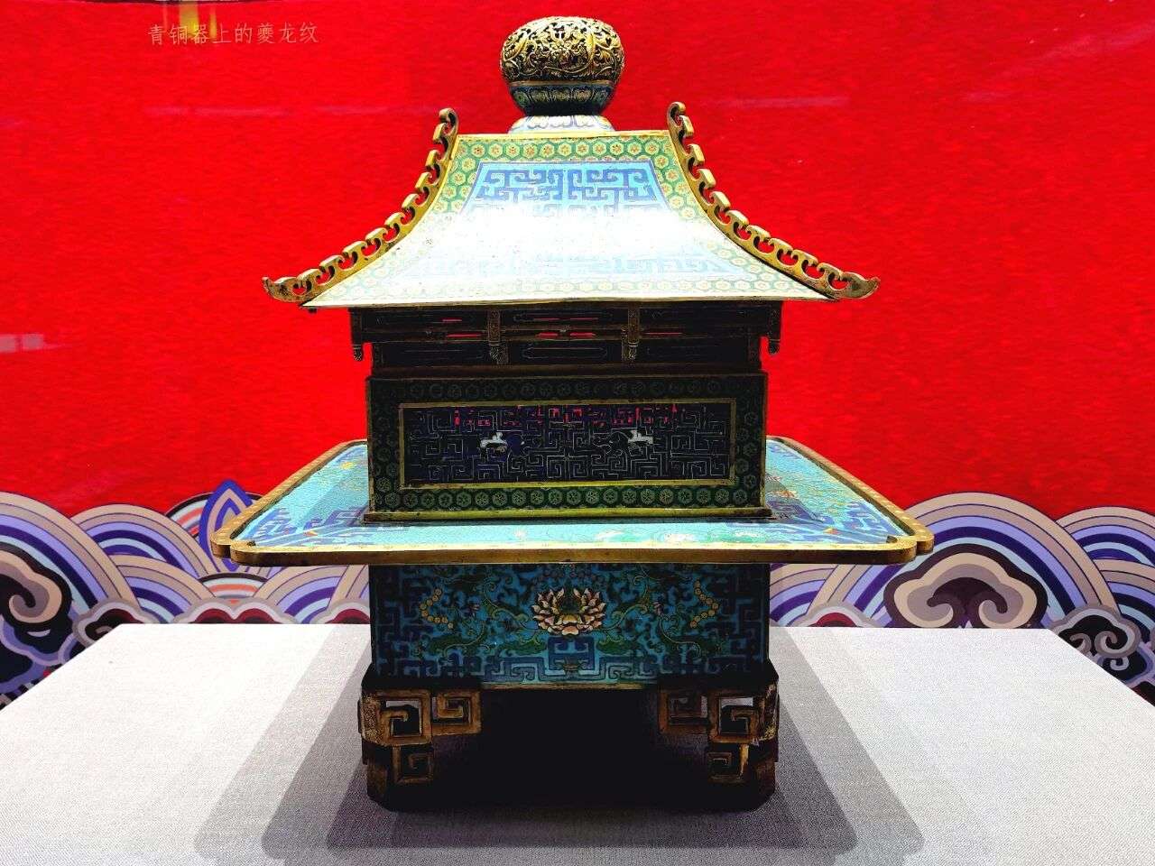其中,夔龙纹是一种独脚龙的侧面图案。沈阳故宫院藏“清掐丝珐琅夔龙纹亭式熏炉”为清宫原藏珐琅器中体量较大的一件,设计精巧。器身由三部分组成,上部为屋顶形,其盖上有铜鎏金四凸脊,脊上饰夔龙纹;中间一节四面均有镂空夔龙纹装饰,展现了清宫精湛的珐琅工艺。