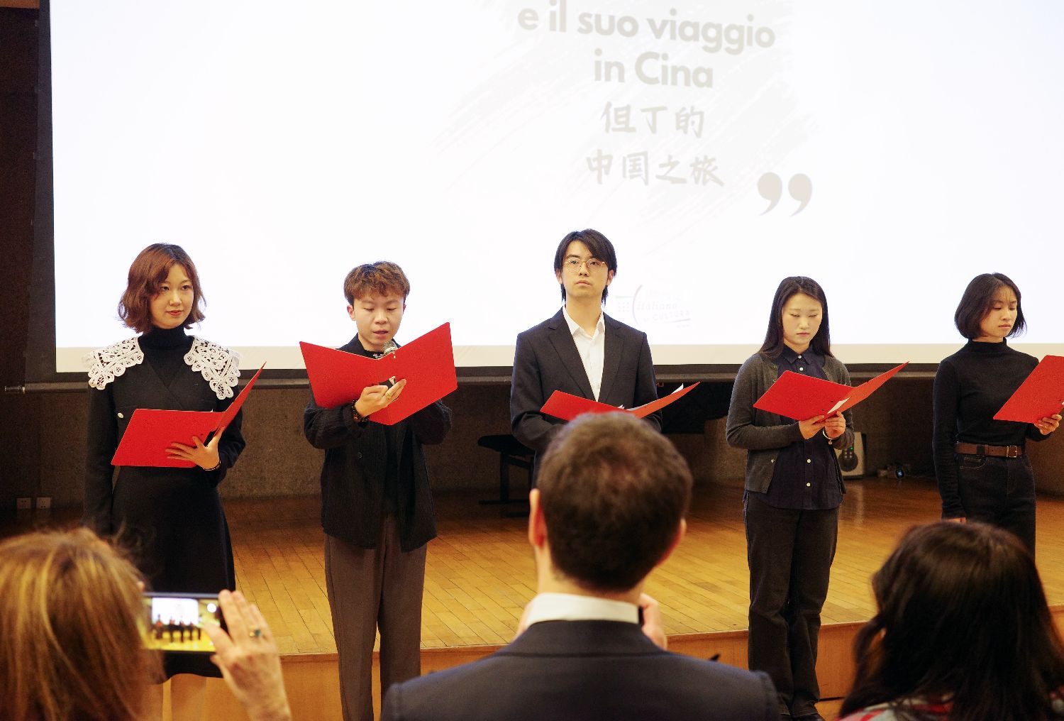 活动最后,北京外国语大学的学生用意大利语朗读了《神曲》选段。通过年轻的声音,这位跨越七百年的诗人再次“发声”:
