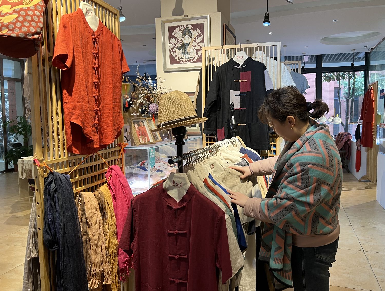 2月5日,重庆市民在“壹秋堂”非遗工坊内挑选夏布产品。(图片来源:中新社)