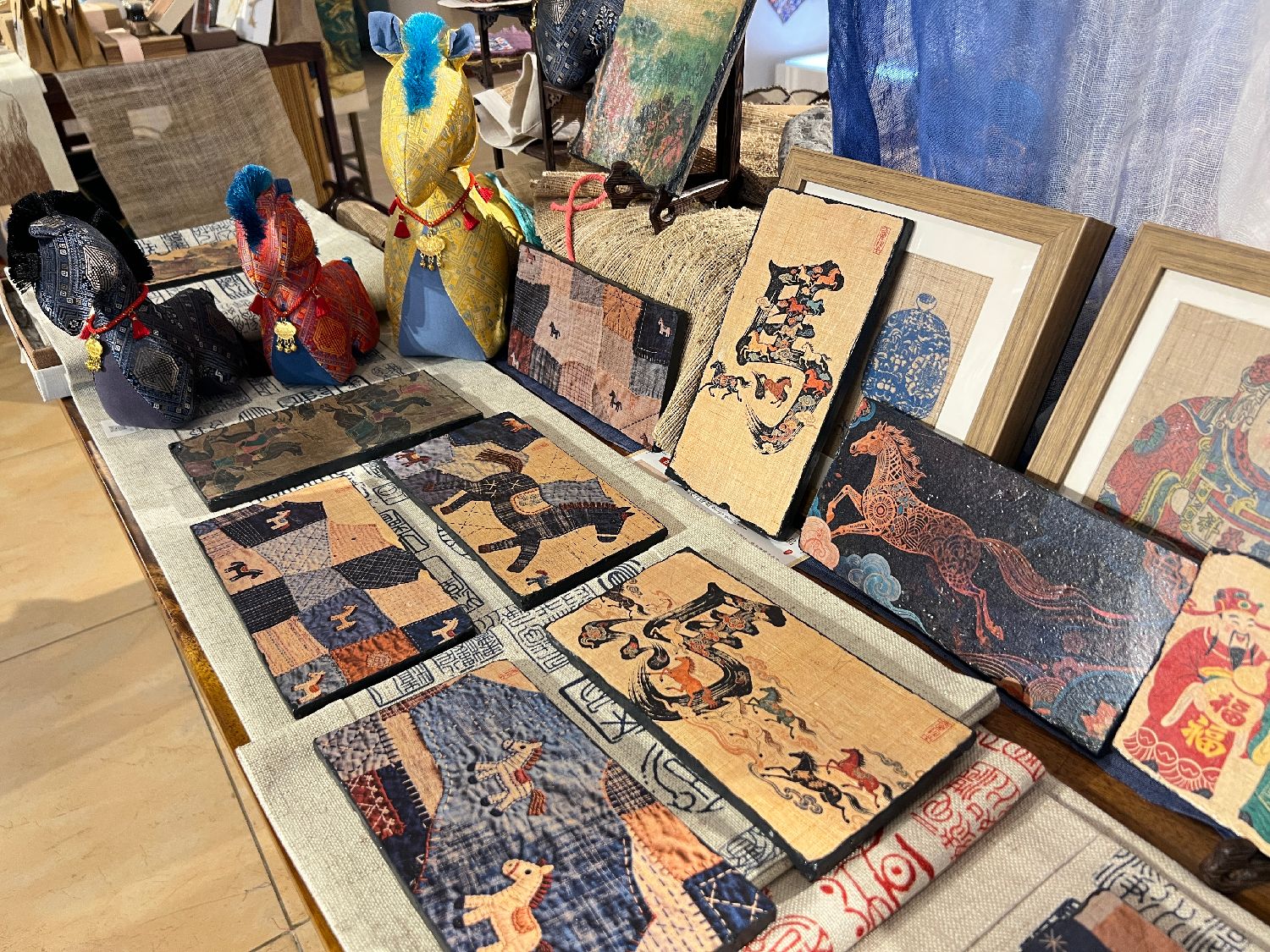 2月5日,位于重庆的“壹秋堂”非遗工坊内,融合夏布与古砖拓印技艺的文创产品“夏布古砖瓦画”呈现马元素。(图片来源:中新社)