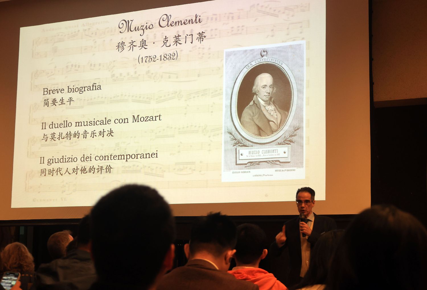 音乐会开场由中央音乐学院教授孟斐璇(Franco Amadei)做简要历史背景导赏。他介绍,克莱门蒂1752年生于罗马,自幼便展现出非凡的音乐才华,并得到一位贵族的慷慨资助,得以前往英国学习音乐,在欧洲乐坛大放异彩,与海顿、莫扎特、贝多芬的声誉齐名。1781年,克莱门蒂来到维也纳,在约瑟夫二世的要求下与莫扎特举行了著名的钢琴演奏比赛,结果双方不分胜负,留下一段佳话。图为孟斐璇为现场听众进行讲解。