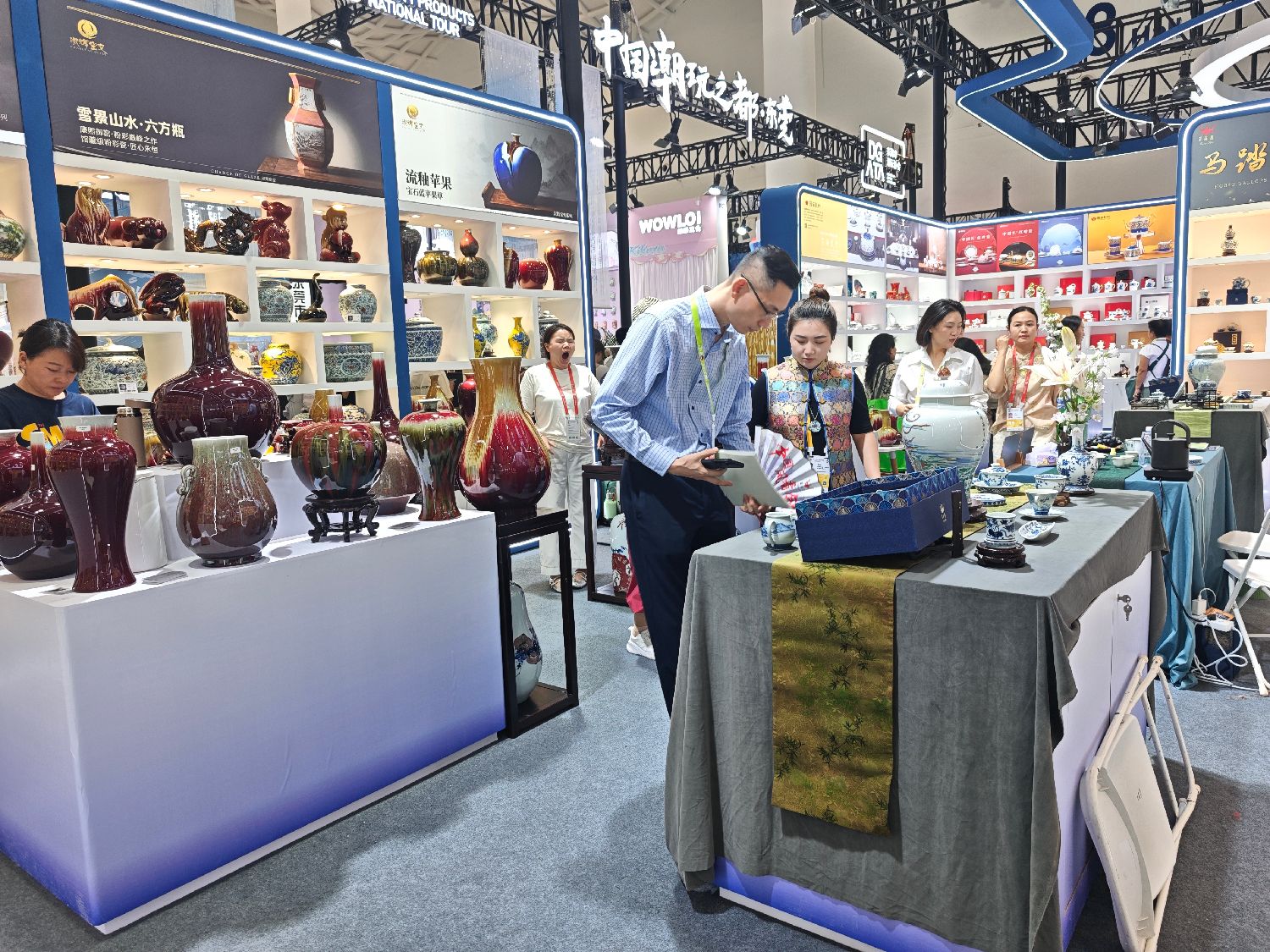 景德镇陶瓷展区内,釉色古朴的瓷器艺术品紧邻着设计简约的现代陶瓷咖啡杯和工业风家居摆件。展区负责人介绍,这些产品在土耳其和沙特阿拉伯很受欢迎。