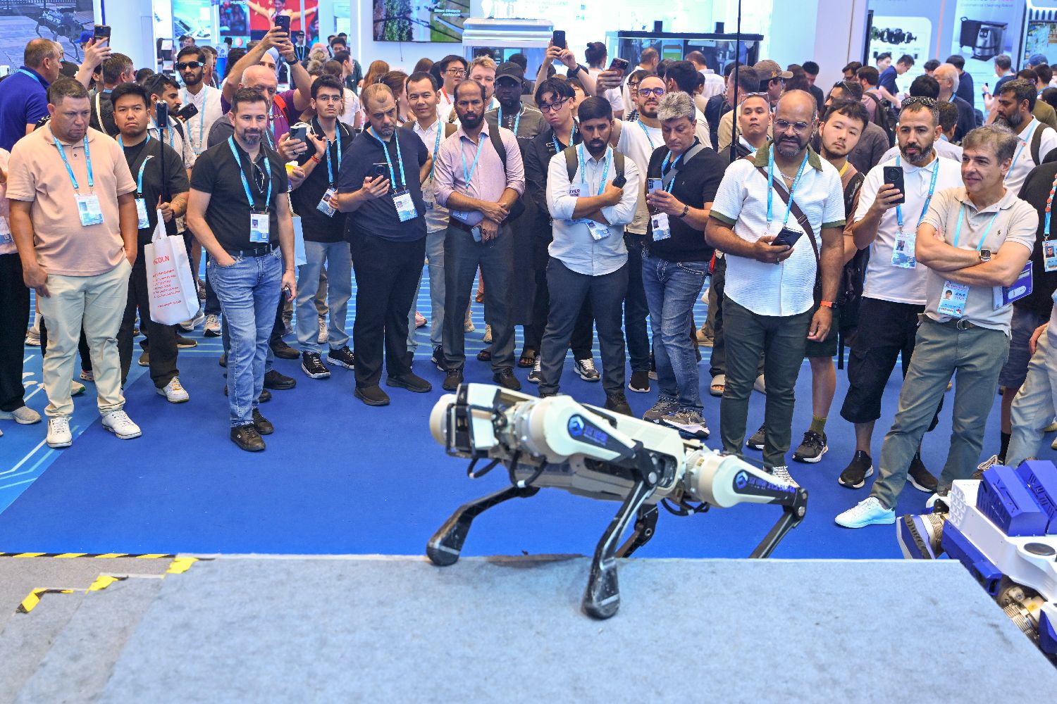 4月19日,第139届中国进出口商品交易会(广交会)第一期在广东广州收官。图为一款四足机器人吸引境外采购商。(图片来源:中新社)