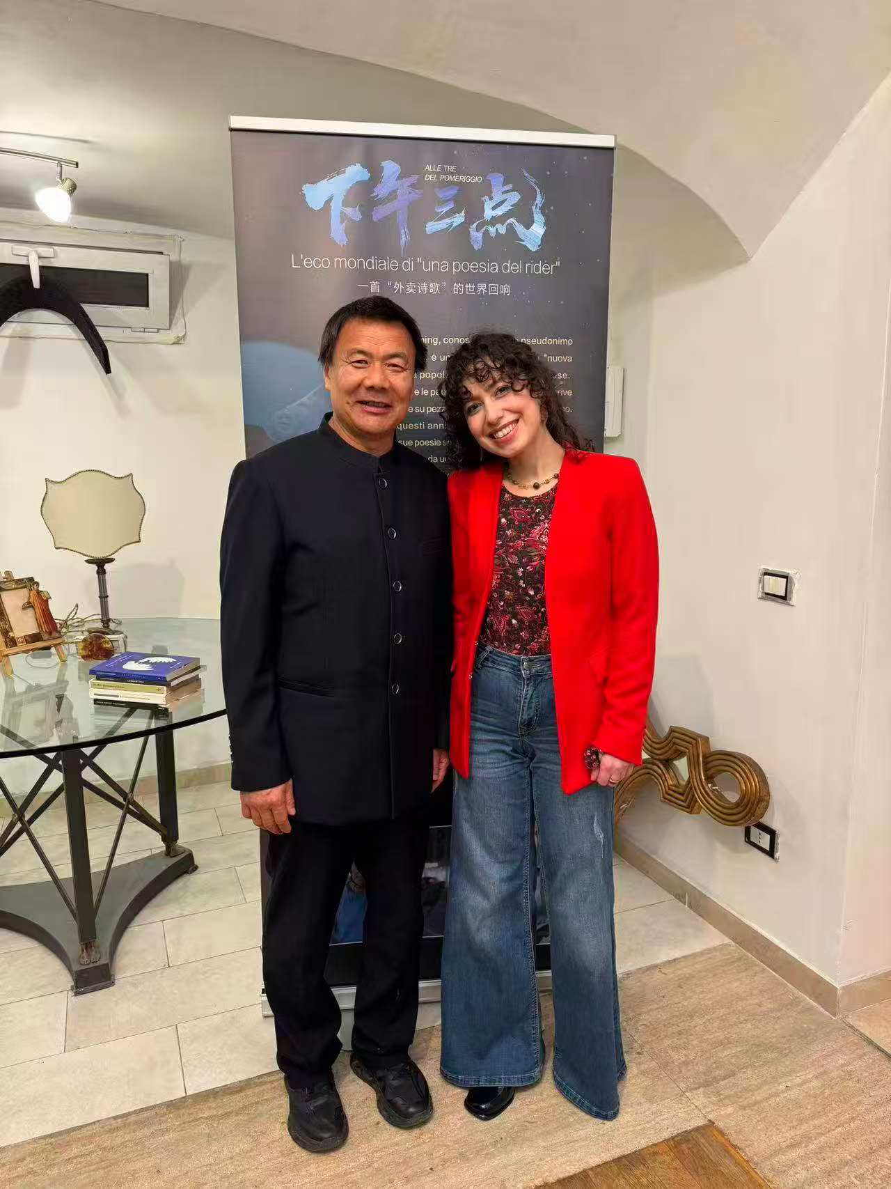 2026年3月,故事有了新的回响。《‘下午三点’——一首“外卖诗歌”的世界回响》专题分享会,在位于罗马的意大利作家协会小剧场内举行。王计兵与林明月比邻而坐,向在场观众讲述他们因诗结缘的故事。